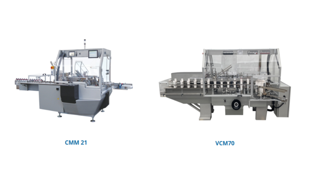 The range includes horizontal cartoners such as CMM 21 and CMM 300, as well as vertical cartoners like the VCM70.