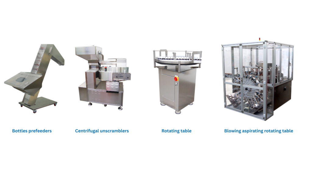 This includes bottle prefeeders (e.g., PFE 1400, PFE 1700, PFE 1800, PFE 1900), centrifugal unscramblers (USC 800, USC 1000, USC 1200, USC 1500), aspirating blowing tables (BRT 1200), and rotating tables (RT 800, RT 1000, RT 1200, RT 1500),