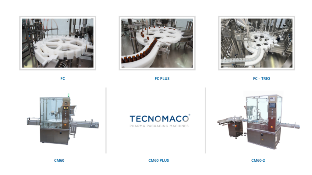 Tecnomaco designs efficient liquid filling and capping machinery (e.g., FC, FC PLUS models) that ensure accurate dosing and secure closures for bottles and vials, tailored for pharmaceutical and nutraceutical production environments.
