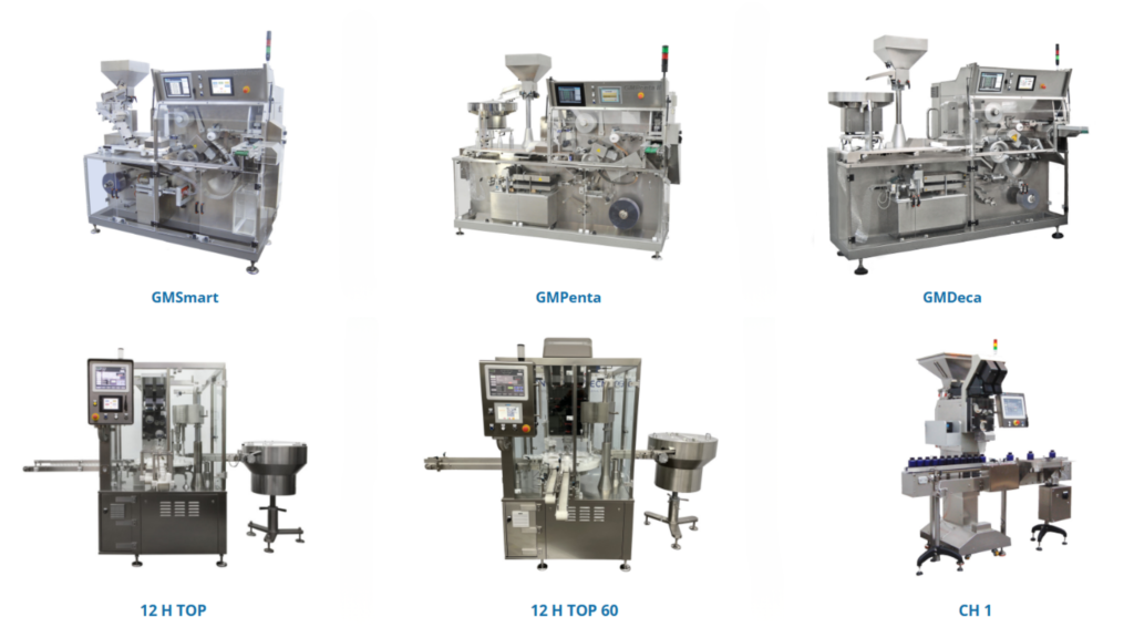 The lineup features counting machines such as the CH1 for high-accuracy tablet and capsule counting, as well as powder dosing machines including MC1 and MC2 that handle powder dosing and optional capping with high throughput and ease of cleaning.